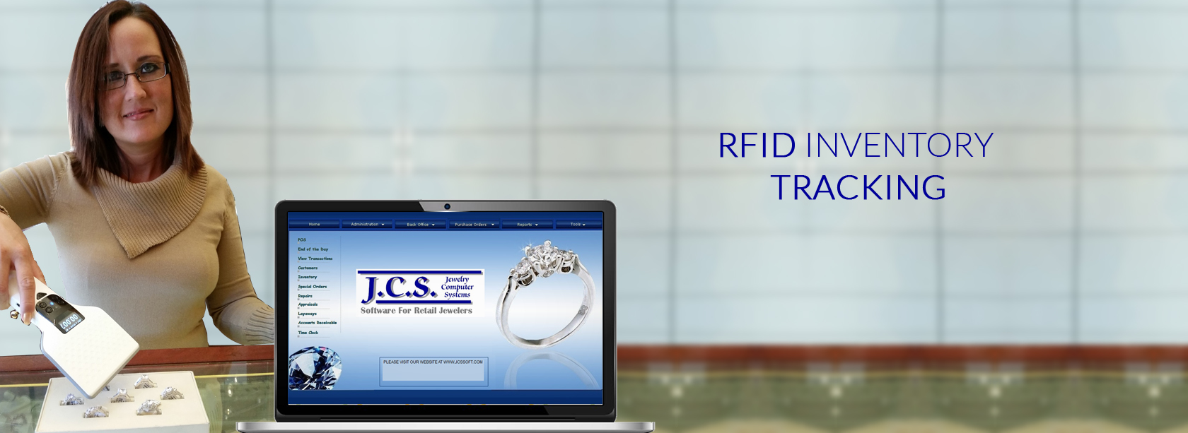 MoreRFID Inventory tracking is 30 times faster than standard barcode inventory. Inventory gets associated to an RFID reusable chip and when you take inventory of a showcase you just scan a wand over the trays or items not in trays and it records the inventory in a file...